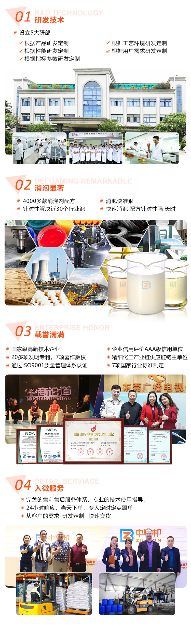 在2017年,曾受牛商論道專(zhuān)訪(fǎng)企業(yè),同年曾受東莞電臺(tái)《歲月留聲》欄目專(zhuān)訪(fǎng)。到目前為止,已研發(fā)4000多款消泡劑生產(chǎn)配方,針對(duì)性解決了近30個(gè)行業(yè)的泡沫難題。主要的消泡劑應(yīng)用行業(yè)有:水處理工業(yè)、金屬加工液、工業(yè)清洗、水性涂料、采礦選礦、造紙工業(yè)、水性粘合劑、發(fā)酵、油田、電池新能源、紡織印染、萃取工業(yè)、建筑材料、油墨油漆、電廠(chǎng)脫硫、泥漿工業(yè)、農(nóng)業(yè)等領(lǐng)域。